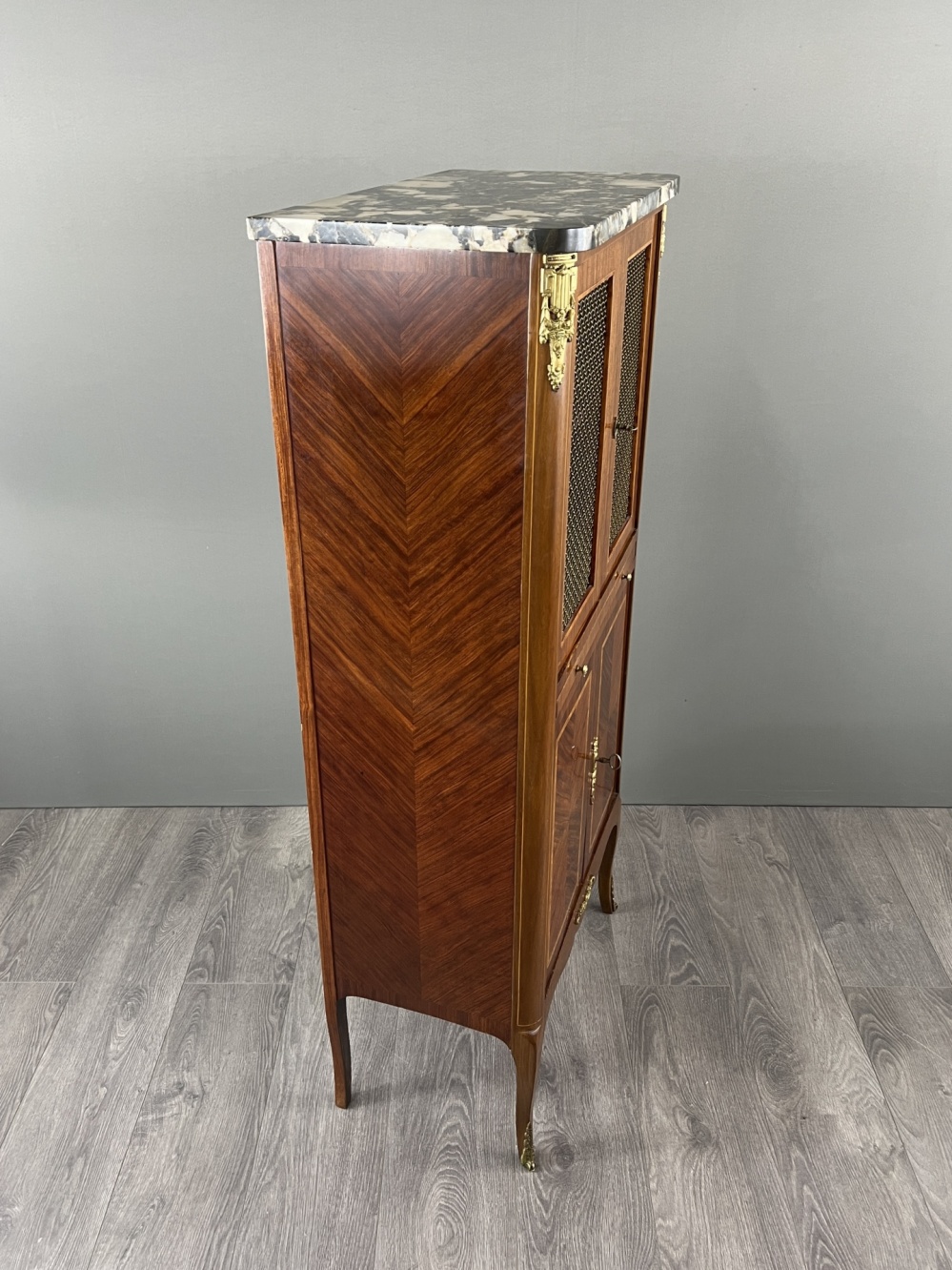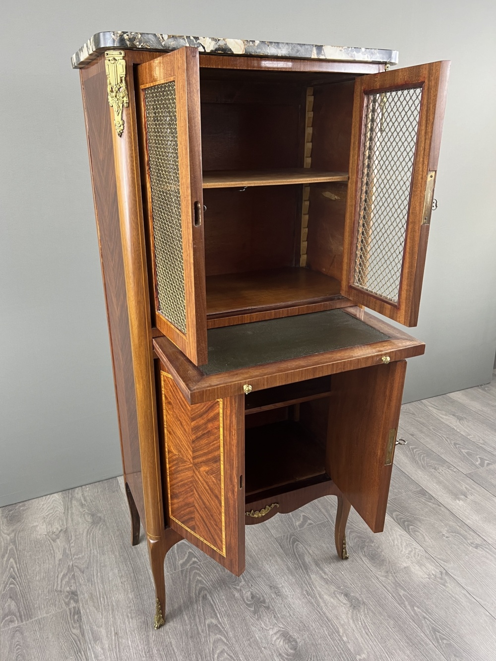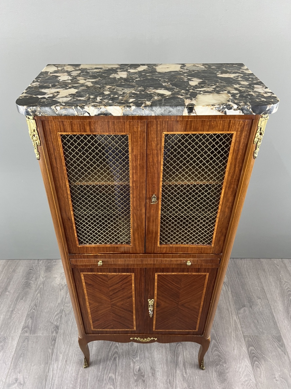 Material: wood, marquetry, marble, bronze, glass