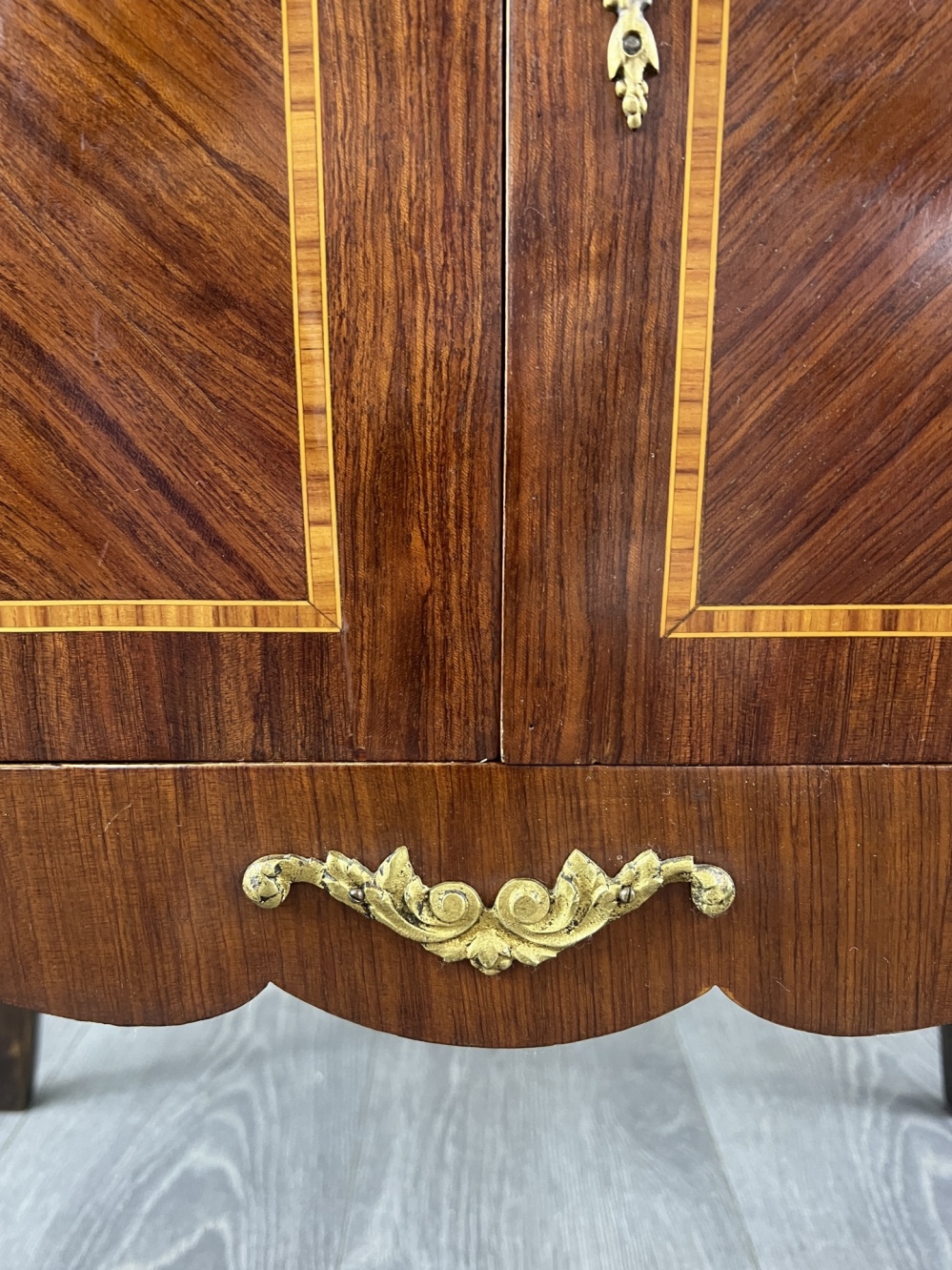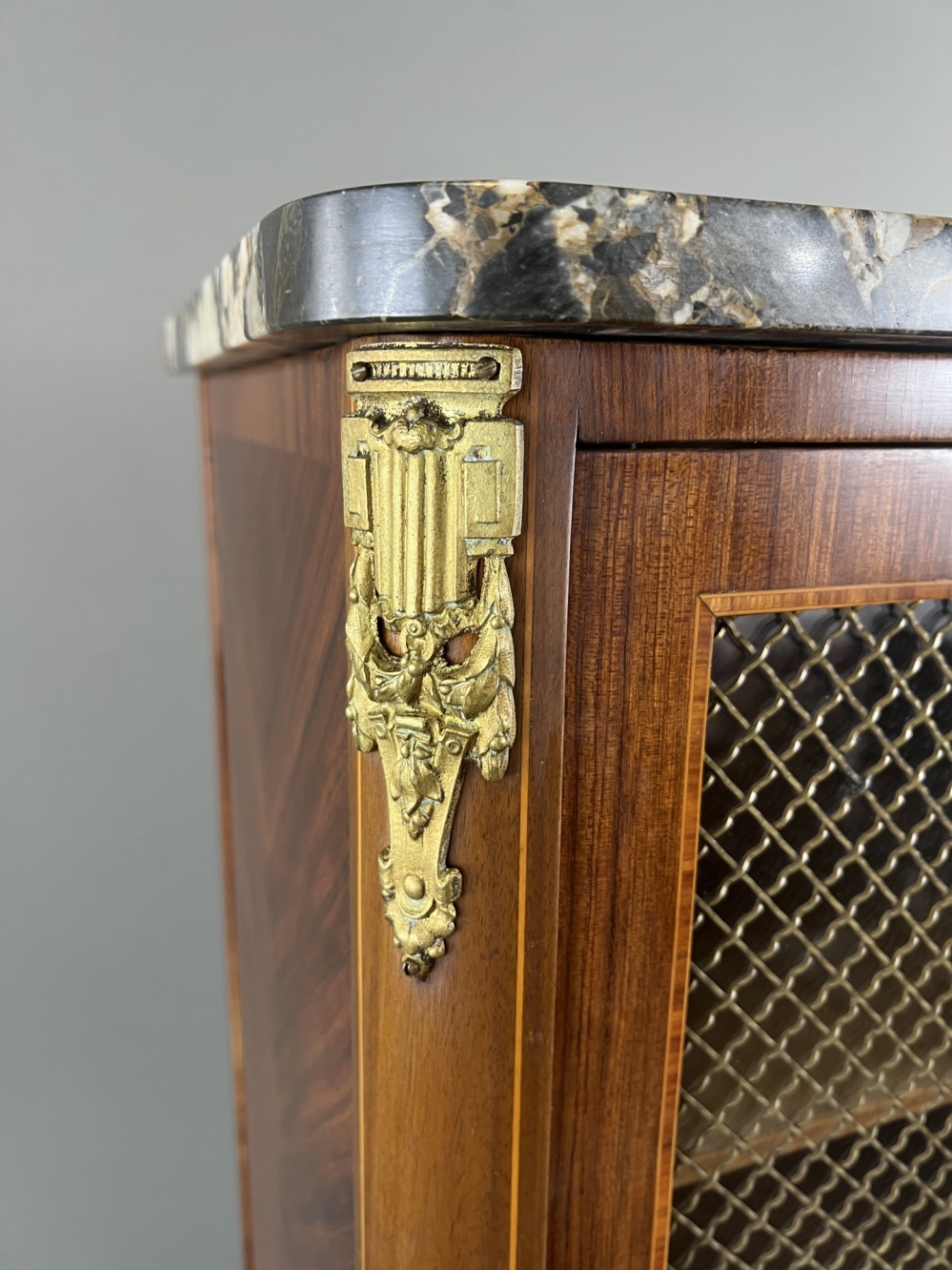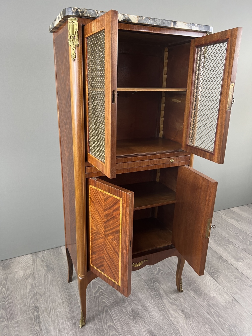 Material: wood, marquetry, marble, bronze, glass